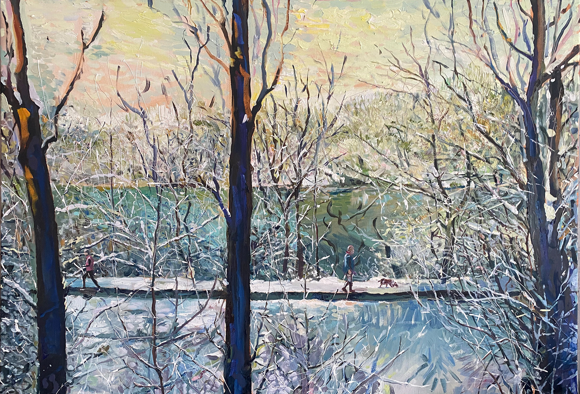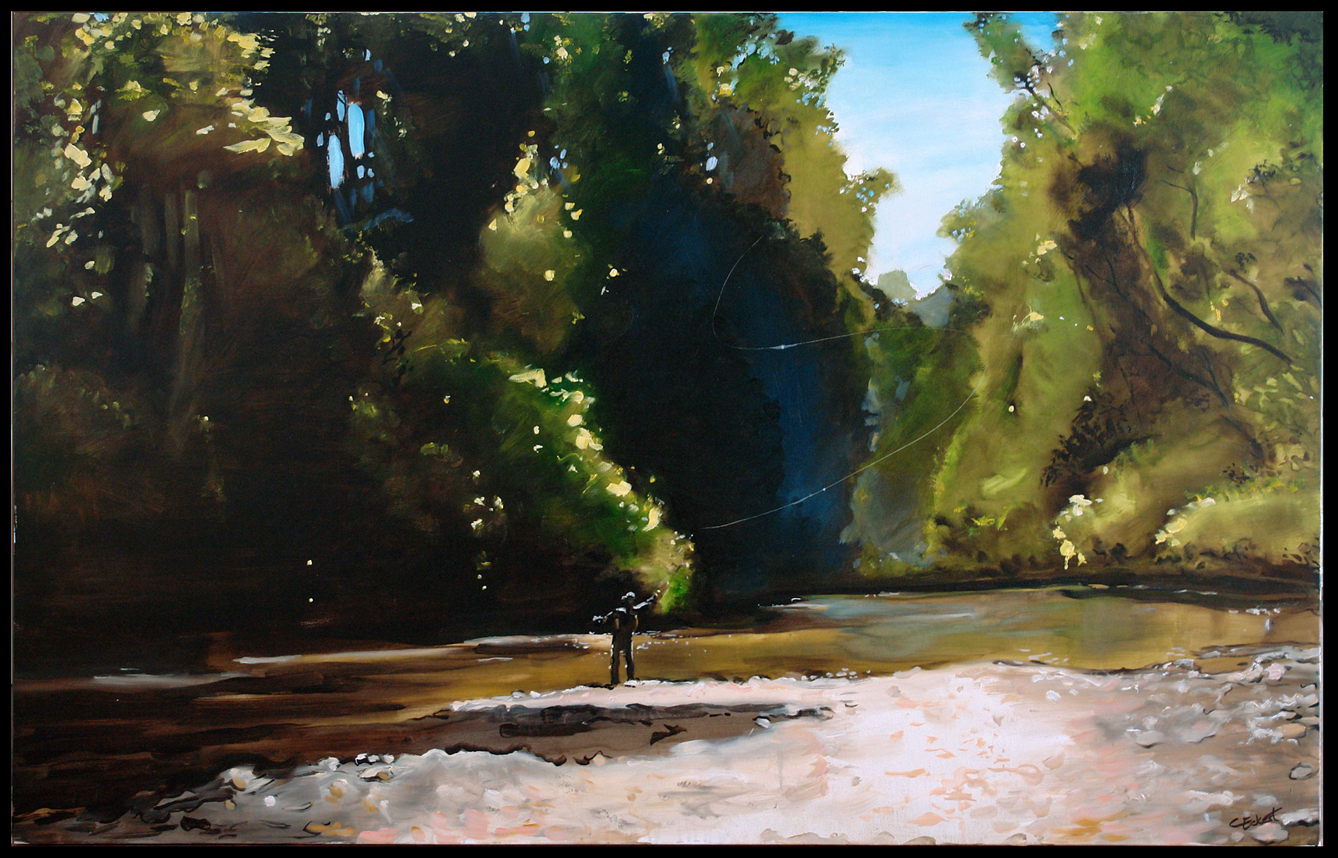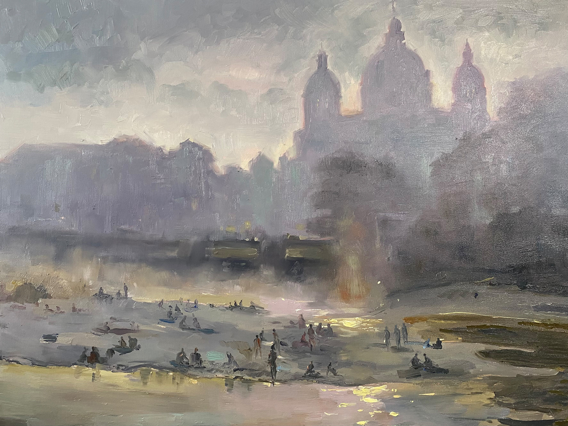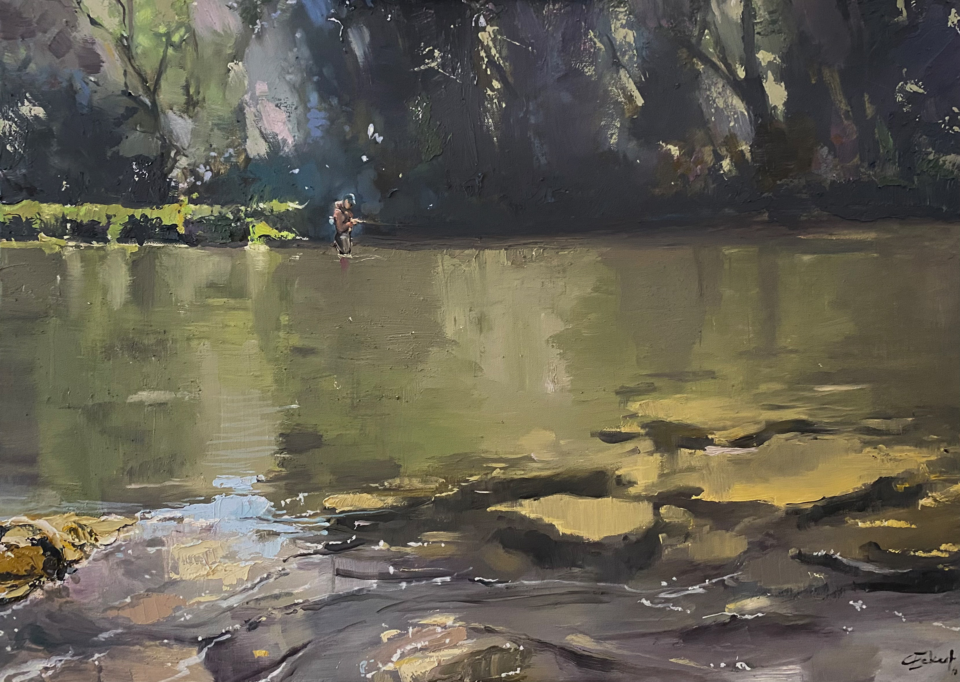 Es gibt Maler, die Landschaften darstellen – und es gibt jene, die Landschaft in ein erinnerbares Bewusstsein verwandeln. Christian Eckert, 1971 geboren, über Jahrzehnte als Illustrator und Karikaturist geprägt, bewegt sich heute in einer malerischen Praxis, die nicht bloß Natur zeigt, sondern Wahrnehmung verdichtet. Seit Mitte der 1990er-Jahre in München tätig, wurde Eckert zunächst als virtuoser Zeichner und scharfsichtiger Beobachter des Allzumenschlichen bekannt: seine Karikaturen für den FC-Bayern-Kalender, Porsche oder Borussia Dortmund haben ihn zu einem vielgesehenen, zugleich subtilen Kommentator gesellschaftlicher und sportlicher Mythen gemacht. Doch seine Malerei wendet den Blick – von der satirischen Überzeichnung hin zur stillen, konzentrierten Empfindung. Die hier versammelten Arbeiten kartieren einen Raum, der geografisch klar verortbar ist – Isar, Münchner Parks, Alpenräume – und zugleich zeitlich durchlässig bleibt. Eckerts Bilder sind Schwellenmomente: *Badende im Sommer* hält nicht eine Szene fest, sondern einen Übergang, ein vibrierendes Dazwischen von Tageslicht und nahender Nacht. Ein mondähnlicher Reflex auf dem Wasser wird zur Achse des Bildes, das Blau des Himmels und das milchige Weiß des Wassers kollidieren in einer fast filmischen Spannung. Diese Bilder sind keine Postkarten des Idylls, sondern inszenieren Atmosphären, in denen Vertrautheit und Fremdheit zugleich koexistieren. af 2022