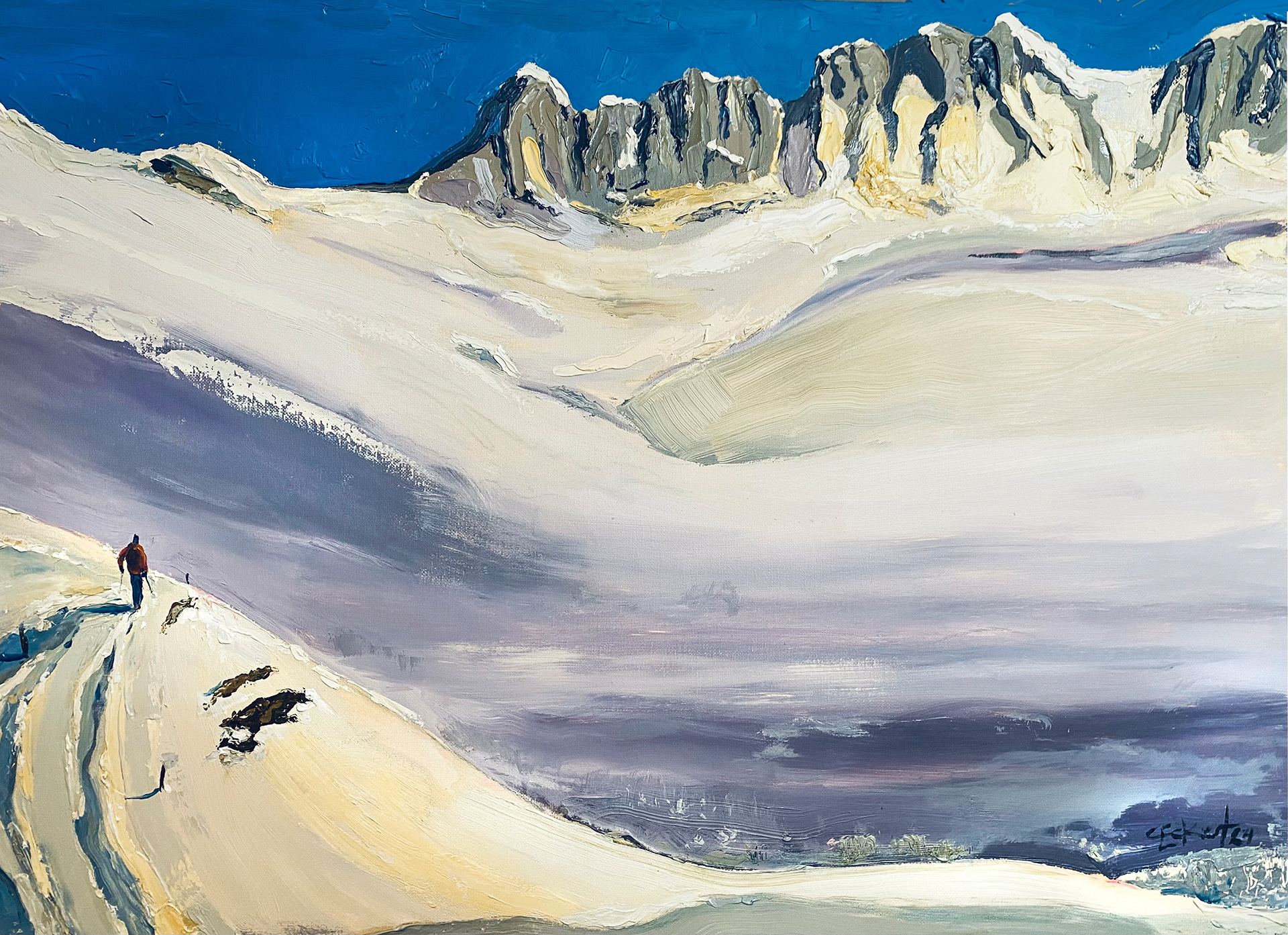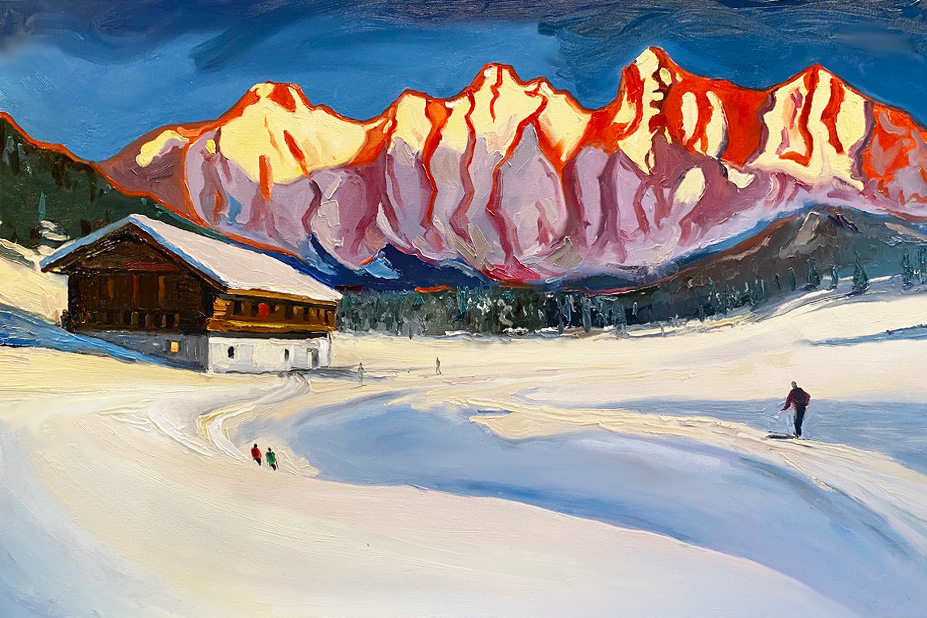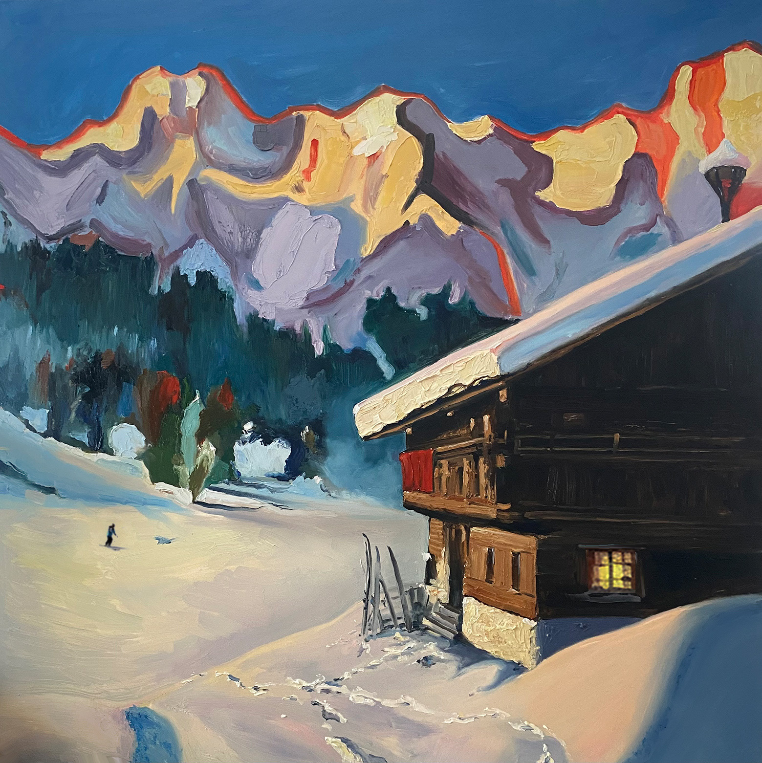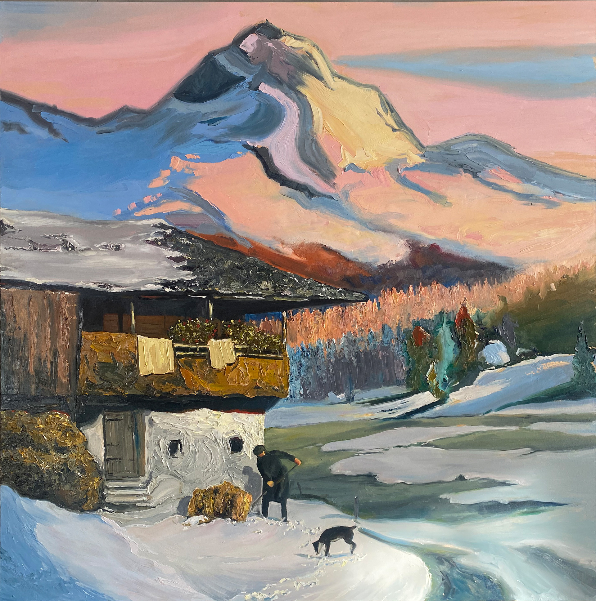 „Ewiger Grat, tägliche Last“ (2025) trifft die erhabene Stille der Tiroler Alpen auf die ungeschönte Realität des bäuerlichen Alltags. Das 100x100 cm große Werk fängt einen Moment ein, der sowohl zeitlos als auch unmittelbar wirkt: Während der mächtige Gebirgsstock im Hintergrund – vermutlich inspiriert durch die Bergwelt rund um Kitzbühel – im sanften Rosa des Alpenglühens badet, verrichtet im Vordergrund eine einsame Gestalt ihre Arbeit im tiefen Schnee.