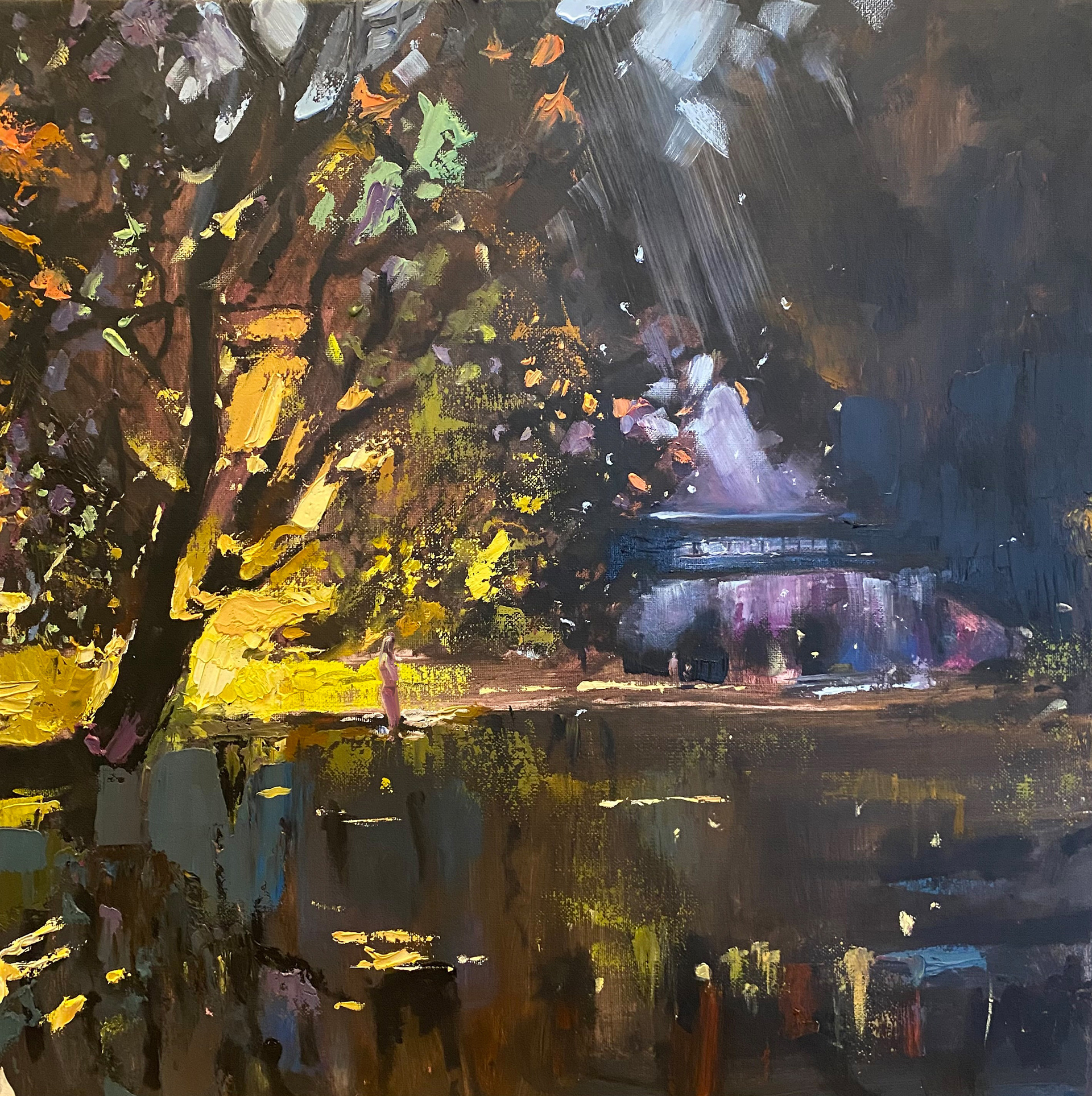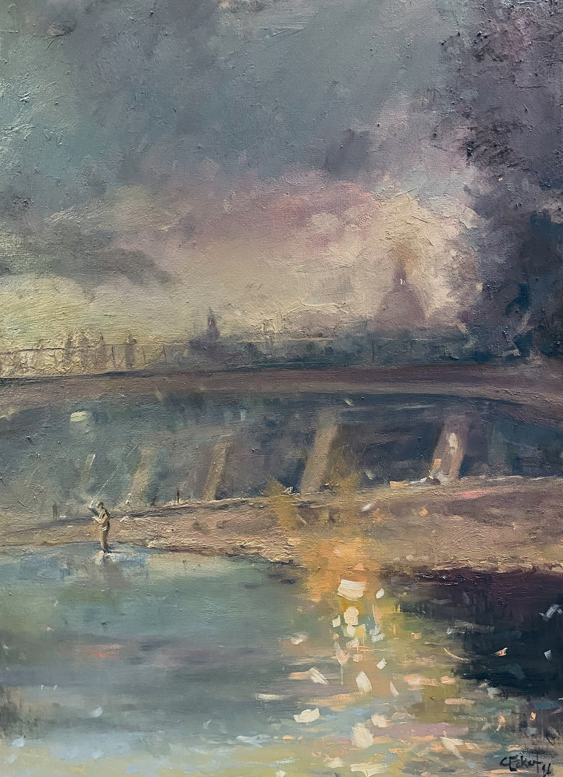 Ein Hauch von Melancholie und goldener Pracht: Christian Eckert fängt in seinem Werk „St. Emmeram Brücke“(50x50 cm) die flüchtige Stimmung eines Münchner Herbstabends an der Isar ein. Mit kräftigem, fast plastischem Pinselstrich lässt er die Uferböschung in intensivem Gelb und Ocker erstrahlen, während die Brücke selbst geheimnisvoll im violetten Schatten liegt.