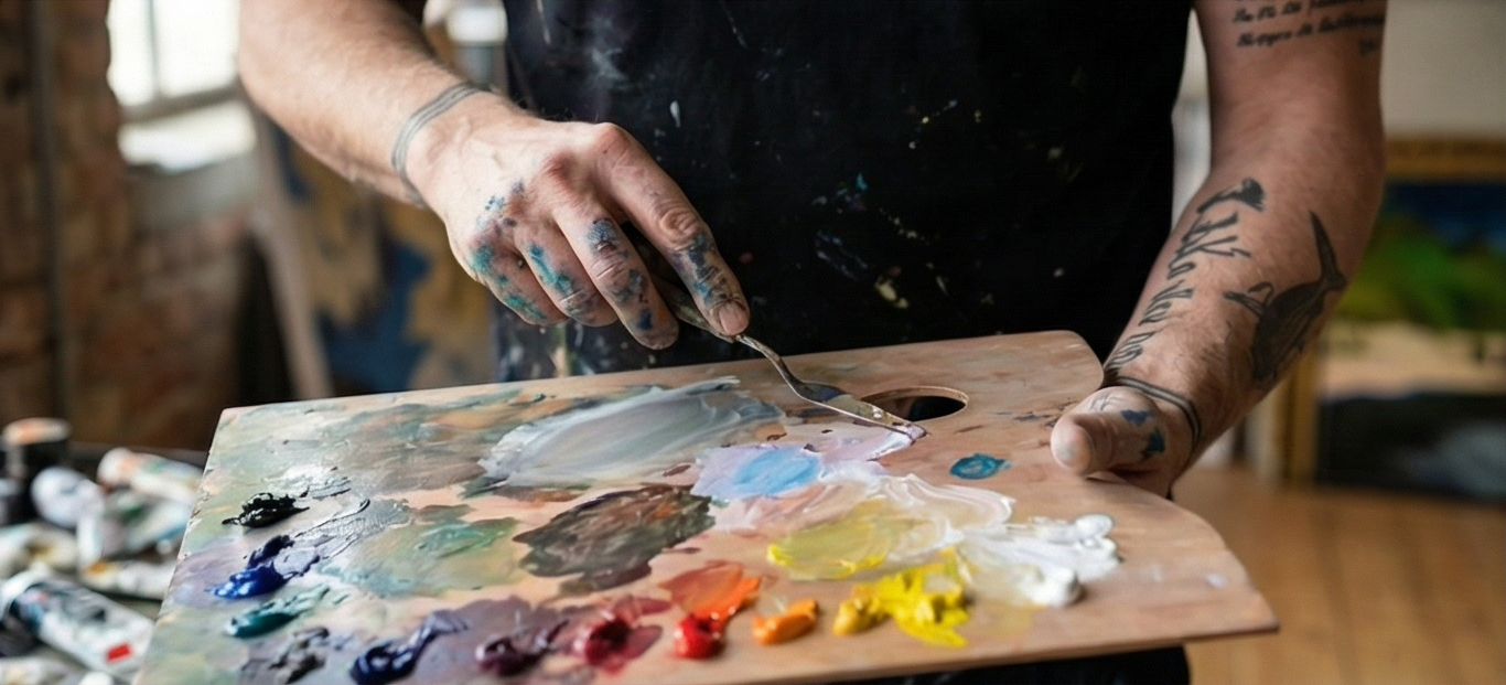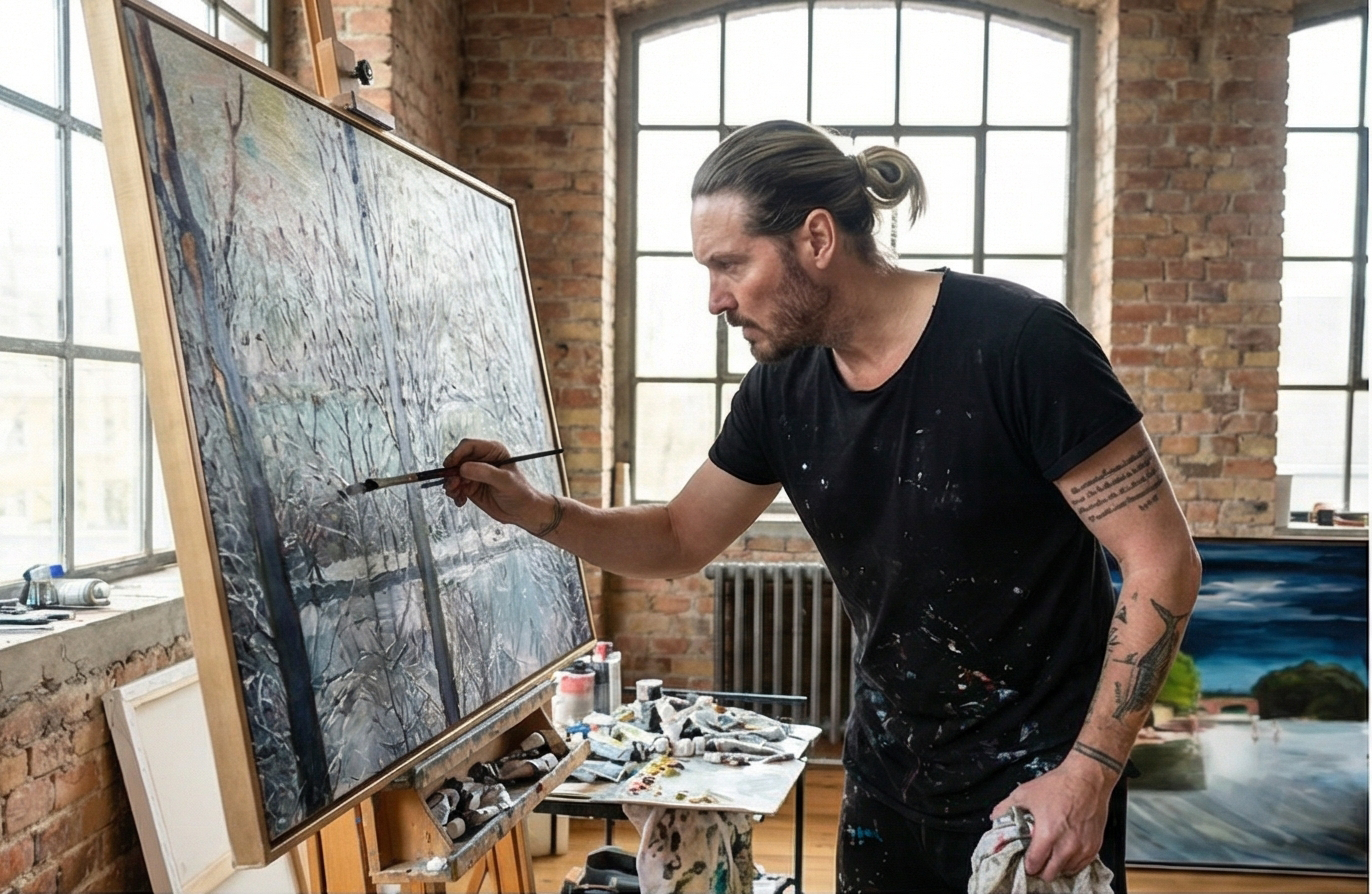 Eckerts pastoser Farbauftrag verleiht dem Schnee eine physische Präsenz, die durch die feinen Spuren der Skifahrer und die einsame Hütte belebt wird. Es ist eine meisterhafte Studie über das Licht der Alpen, die die Grenze zwischen traditioneller Landschaftsmalerei und moderner Abstraktion mutig überschreitet.